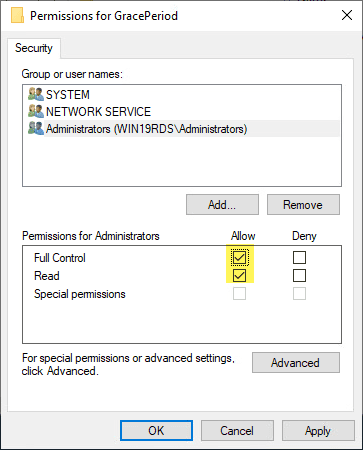 - Change permissions on the RCM > GracePeriod key