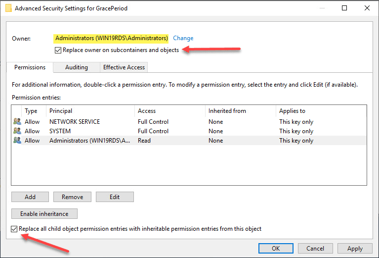 Now that we have changed ownership on the key, we can actually set permissions without getting permissions errors. Here I am granting administrators full control on the key.